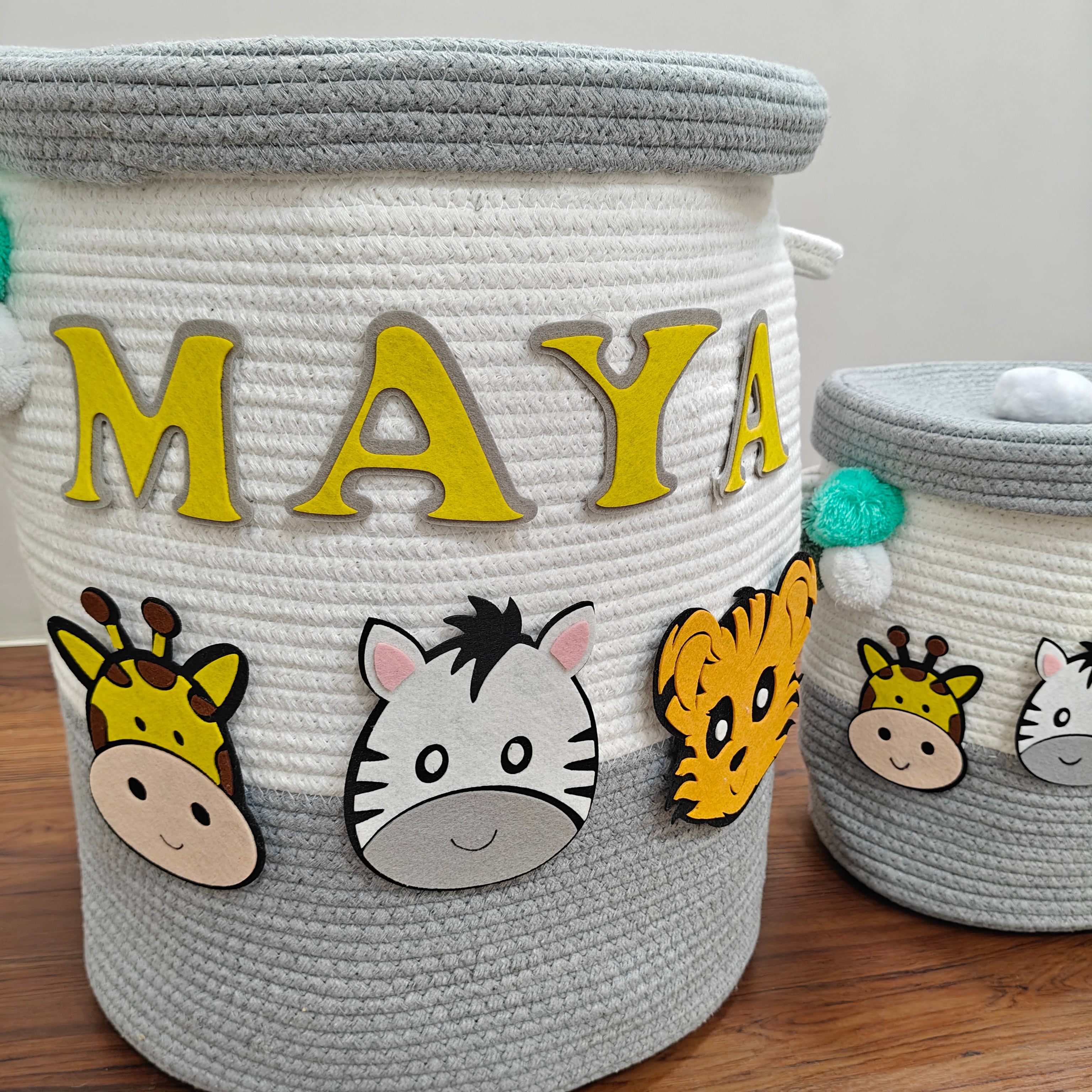 Our Basket crafted from durable jute and soft cotton, it offers both sturdiness and comfort. Perfect for carrying books, toys, or treasures, this basket is as functional as it is enchanting. Elevate your child's storage with a sprinkle of magic and practicality, and let their imagination soar among the stars. This Smoky safari theme basket in bright hues serves as a dual purpose of both kid's room decor as well as storage made easy with two convenient sizes and comes embellished with delightful designs of Tiger , Zebra ,Giraffe .