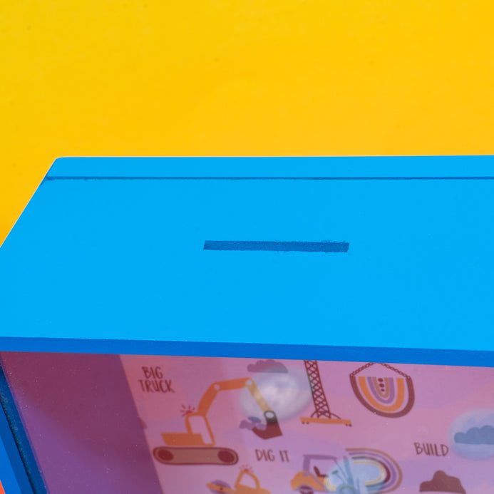 Our adorable blue shadow box piggy bank for kids! is a quirky and fun way not only a great way to teach children the concept of saving money at an early age, but it also makes for a fantastic personalized gift. The shadow box design provides a unique and creative way for kids to watch their savings grow as the box fills up. With its bright blue color and customizable options, this piggy bank is guaranteed to be a hit with any child. Help your little ones develop valuable financial skills while adding a touch of whimsy to their room décor with this delightful shadow box piggy bank.