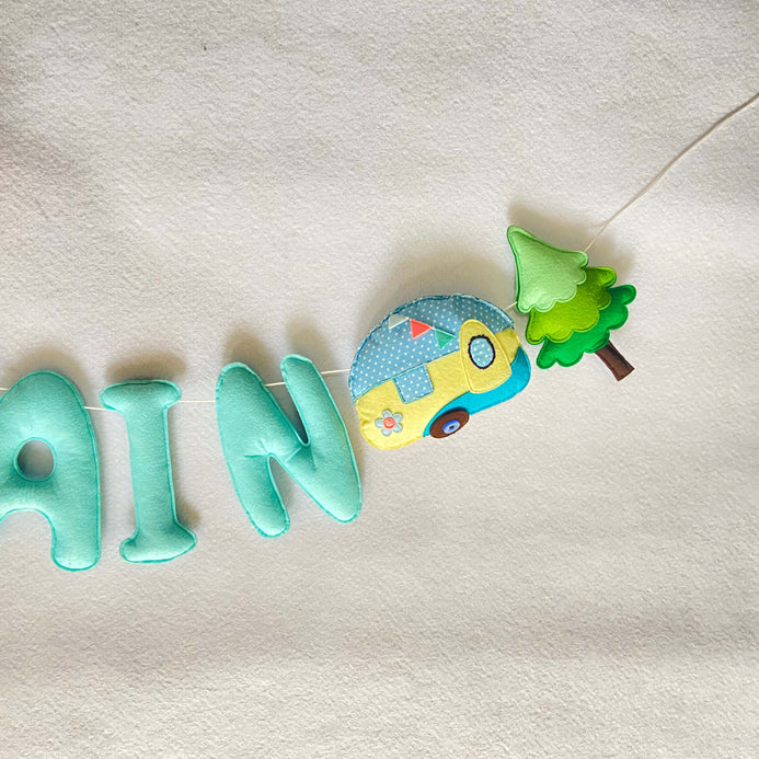 Our cute Customised felt camping themed garland immediately sets the tone to your kidàroom dïr. These can be hung across walls or on cribs or the kids shelf or kids room door. Decorated with different colourful trees & camper van, this bunting can make perfect addition to the kidàroom theme.