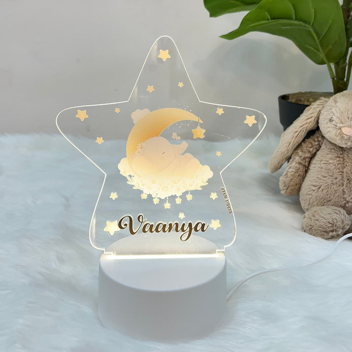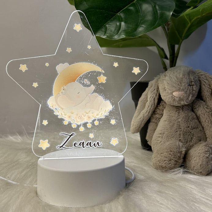 Enhance your baby's sleep space with our Elephant on a Moon Themed Acrylic USB LED Night Lamp, uniquely personalised for your bundle of joy. With its gentle illumination and customisation options, it's the perfect blend of practicality and sentimentality. Say goodnight to restless nights and hello to peaceful dreams.