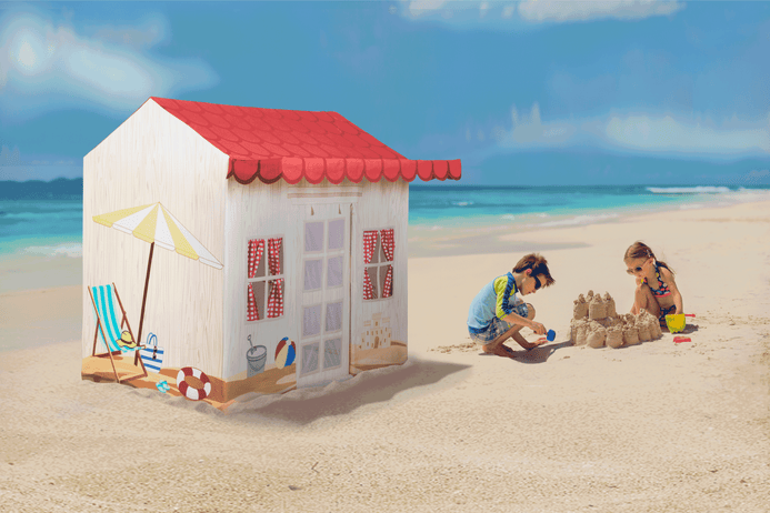 Bring the beach indoors or to your garden and enjoy a lazy day on the beach with our fabulous Beach House Play Tent. It will inspire a day of fun with ice creams and sandcastles. The terra-cotta shingled roof adds an excellent detail to the beach house. The beach house features a portico shade in front of the house that gives it a new dimension. The walls of the beach house depict familiar scenes from the beach of sandcastles, beach balls, deck chairs, beach umbrellas, slippers, beach bags with sunglasses, and a sailboat.
