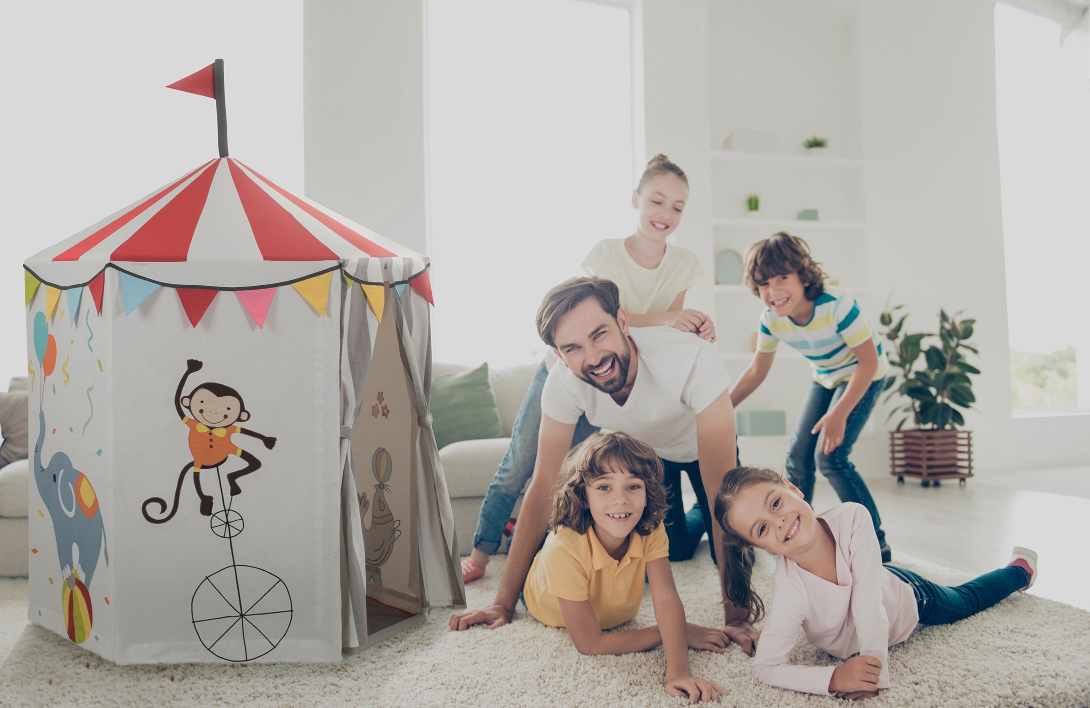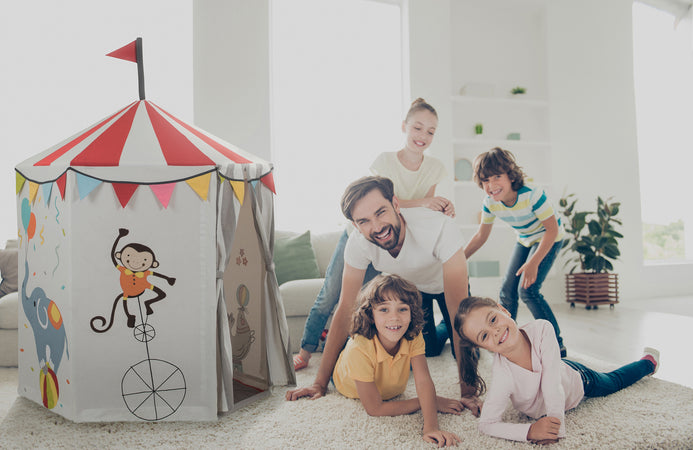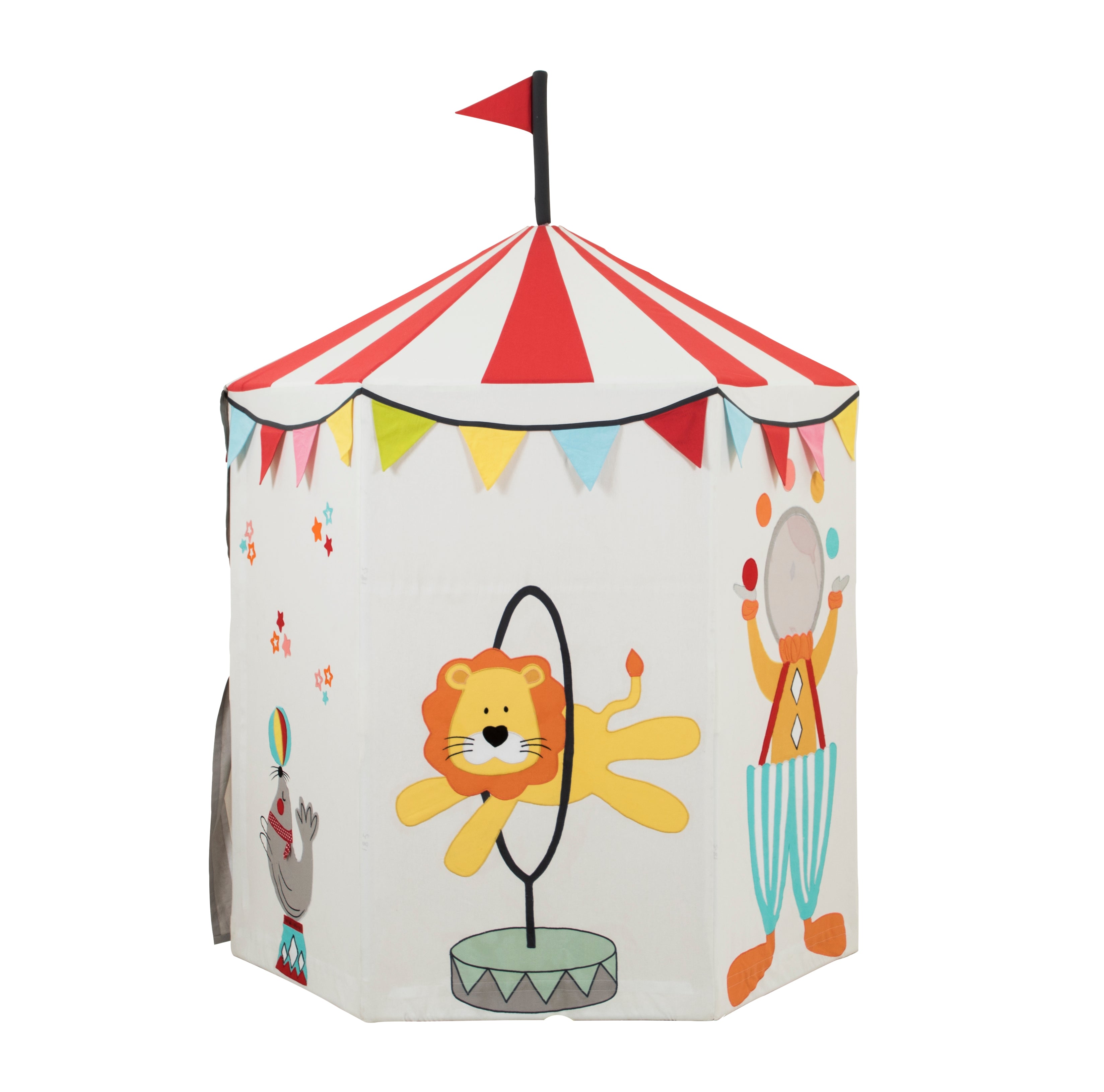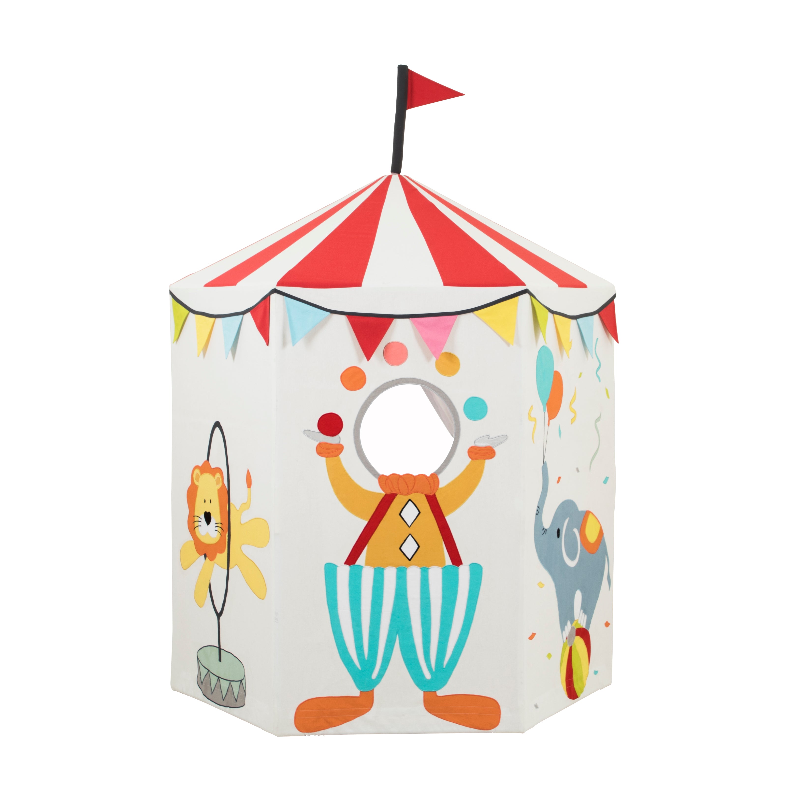 Ladies & Gentleman, boys & girls, children of all ages, come in to the Circus! Bring home this playhouse and give your child the opportunity to role play in an old fashioned Circus. Marvel at the acrobats, laugh with the clowns & sing to the music in imaginary performances. This deluxe Circus Tent is brought to you by Role Play™, manufacturer of premium handmade pure cotton tents. The walls depict the classic scenes from a circus & of course include its favorite stars - an elephant, a monkey, a lion and a seal. The clown images also double as a photo booth for children to stand inside the playhouse and get their picture taken. Boys and girls would enjoy hours of fun with this pretend play Circus Tent. We even include 3 juggling clubs so kids can put on a show right out of the box. The Role Play™ Circus Tent Playhouse is made of 100% Cotton fabric. The fabric shell snugly fits on a metal frame. It is easy to assemble and no tools are required. Role Play™ brings 25 years of expertise in textiles to our boutique collection of inspired designs for children. Our avant-garde studio is brimming with a team of talented designers & tailoring specialists to create toys that spark the imagination of children of all ages. Enjoy your very own Role Play tent today.