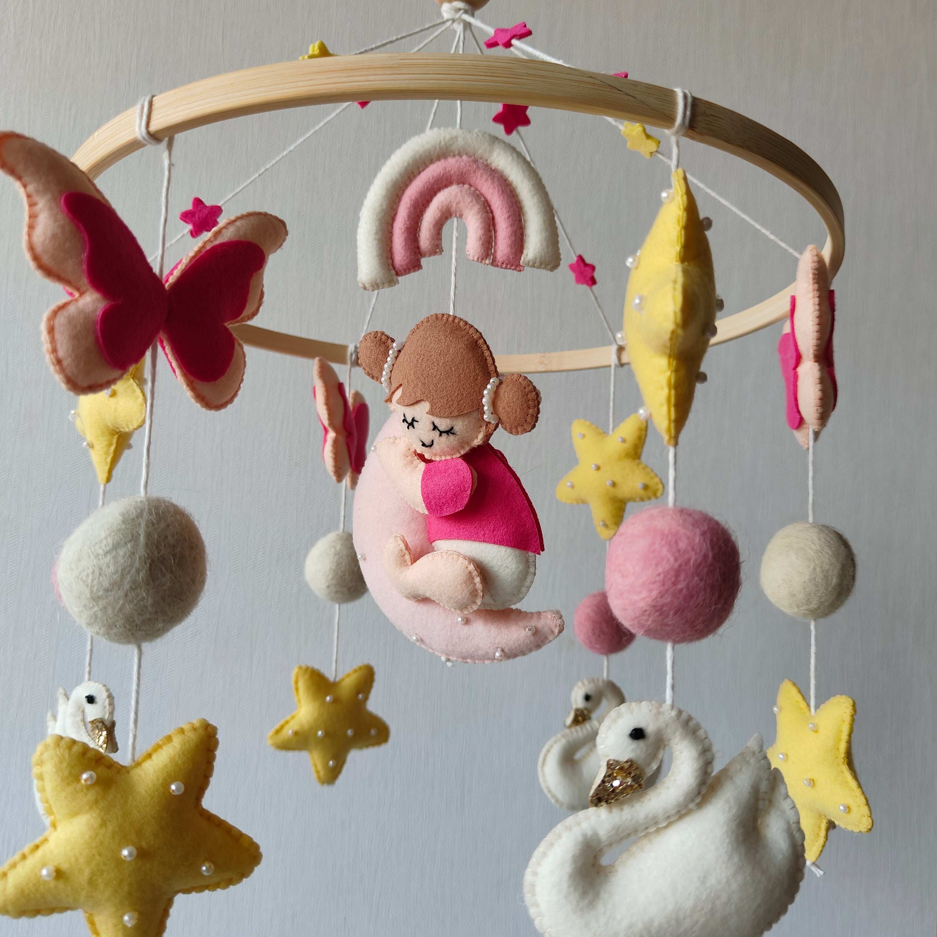 This mobile features the Stars, Hearts, Moon, and a Dreamy Princess. Each of the elements are attached to the wooden ring using cotton thread.