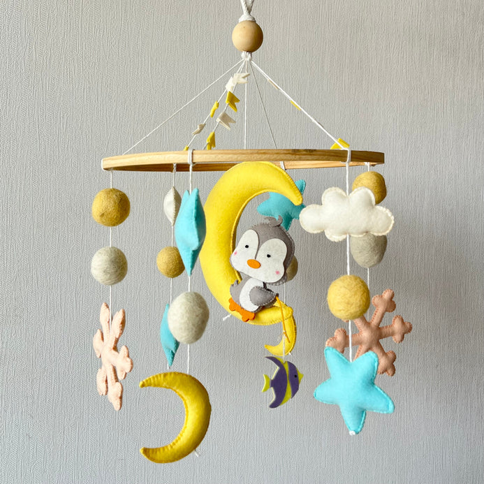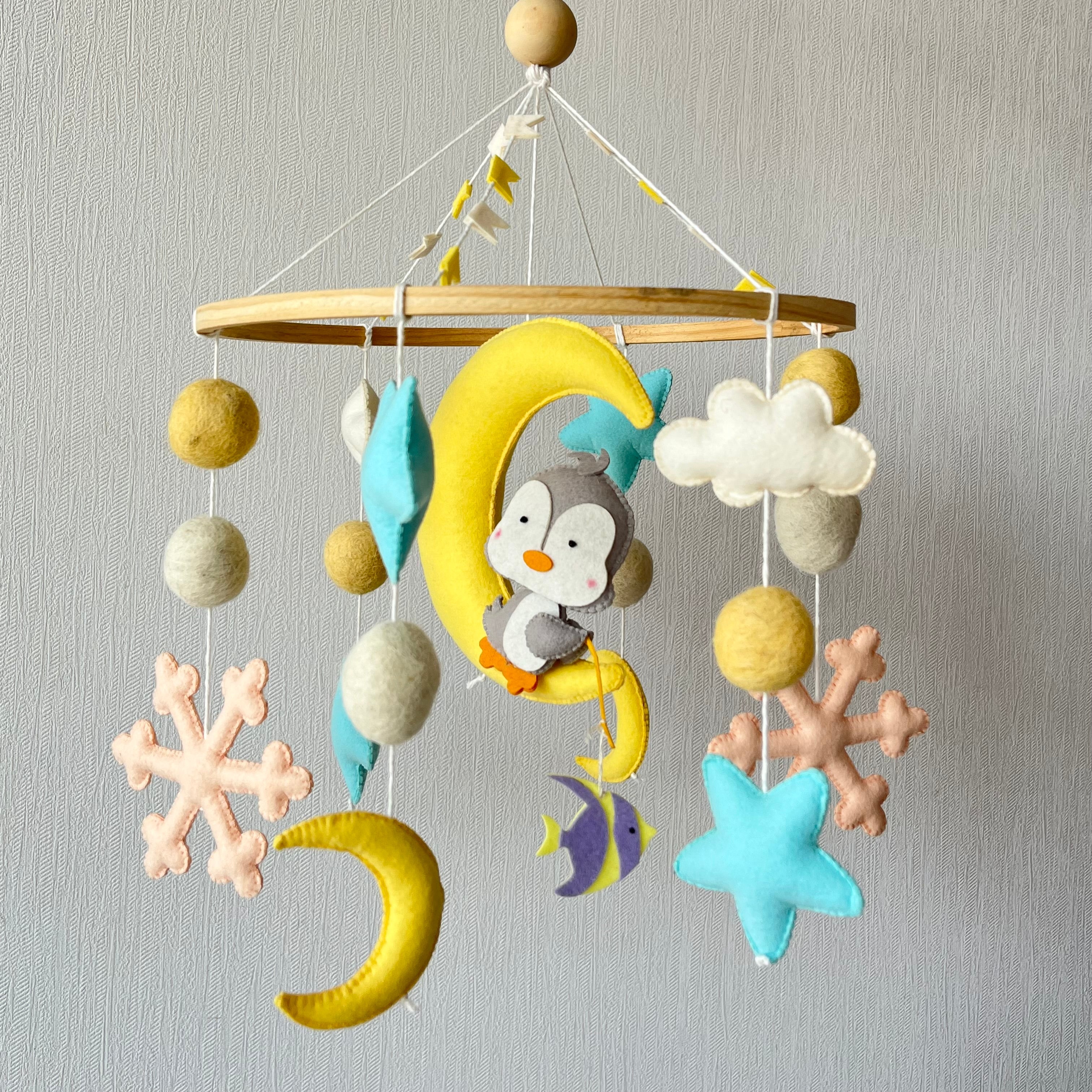 This mobile features the Stars, Moons, Clouds, Snow-Flake and a Penguin on a Moon. Each of the elements are attached to the wooden ring using a cotton thread.