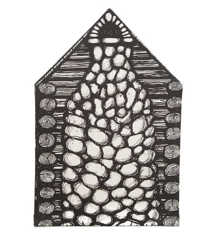 - Illustrated fabric print of logs, stone chimney, and "hinged" door