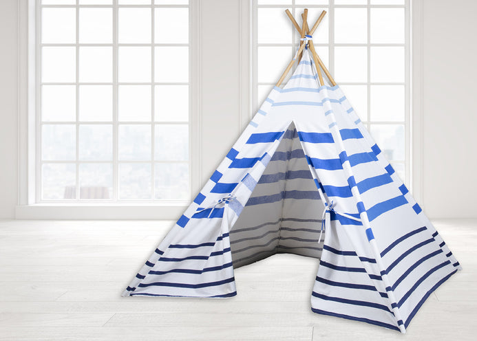 The cotton canvas fabric boasts a stylish print adorned with classic nautical stripes, adding a touch of maritime charm to the surroundings. This eye-catching detail not only enhances the visual appeal of the structure but also ensures that it effortlessly complements a wide range of interior styles, making it a versatile and chic addition to any space. Sturdy Framework: Metal, Bamboo Poles, and Nylon Connectors.