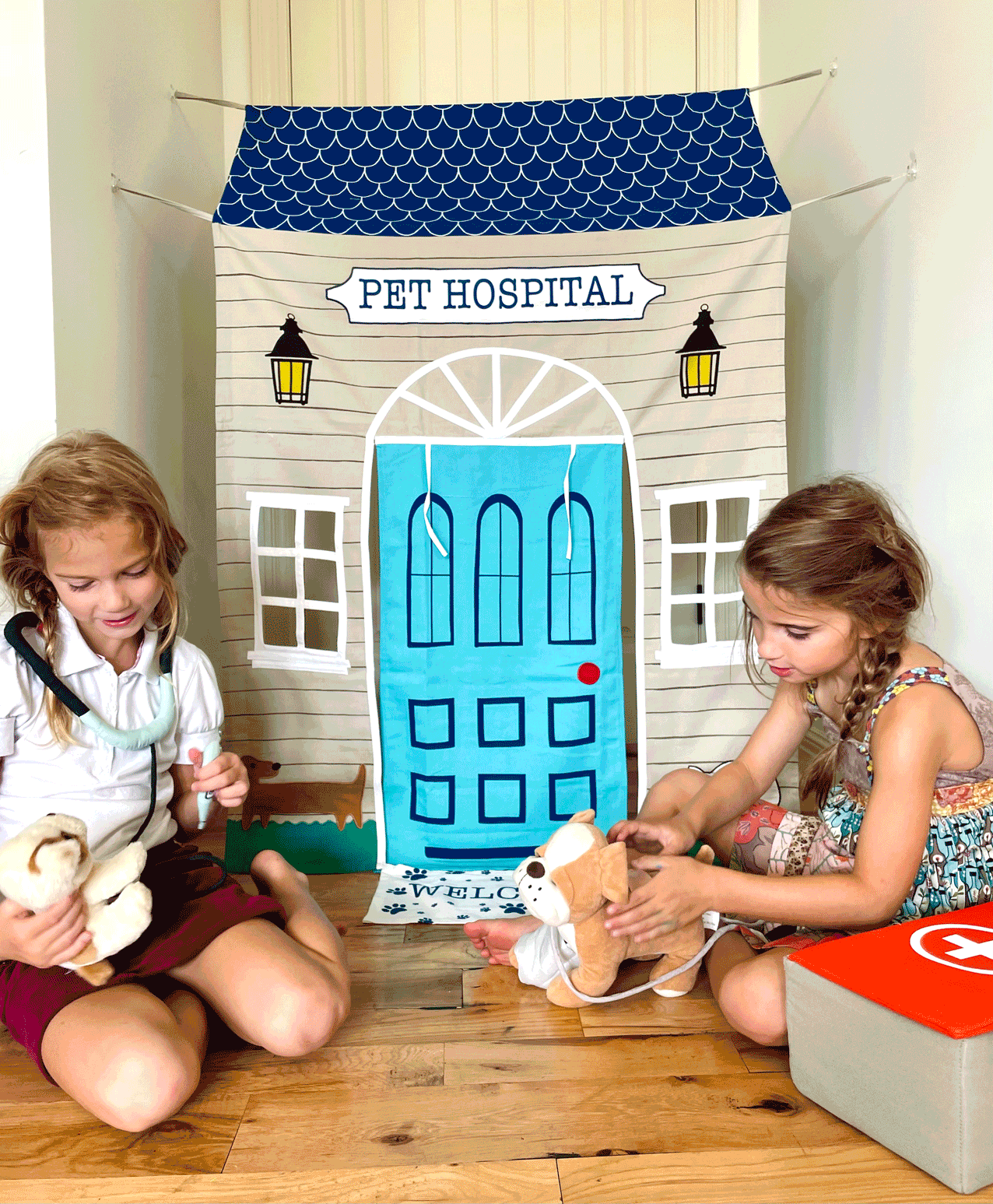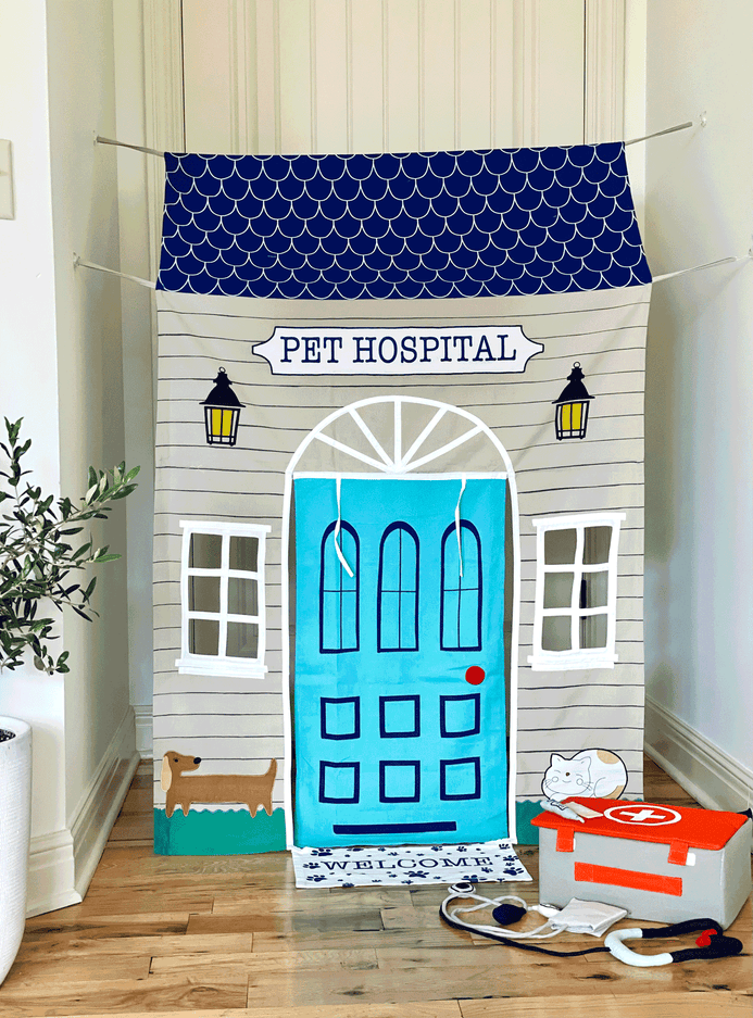 Love the sound of puppies going woof and kittens meowing? This wonderful set will allow your little ones to live out their veterinary dreams. Supported by a doorway or a hallway and your little one's imagination, the brightly colored tent temporarily transforms any space in the house into an adorable veterinarian's office scene. Got puppies to help? The kiddie-size veterinary kit and its caring contents assist your veterinarian-in-training through any type of examination temporarily. The quick-to-assemble doorway play tent can be taken down with ease when using your favorite damage-free hanging adhesive hooks. The product is hand sewn and silk screened.