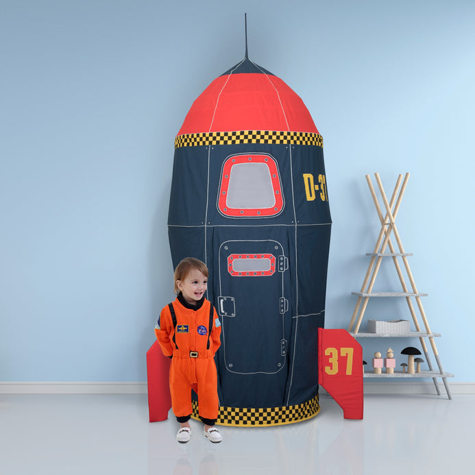 Rocket ship features an illustrated fabric print of rocket with port windows, detachable fins, airlock door, and flexible hoops. Just hang from the ceiling and watch the room transform. Great for pretend play or a little reading nook