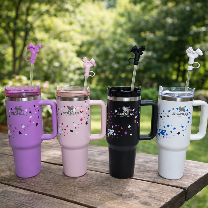 The Midnight Pop Icon Quencher brings bold black with vibrant star bursts — inspired by stage lights against a midnight sky. Designed for those who love a little drama (in the best way), this 40 oz tumbler makes a powerful statement.