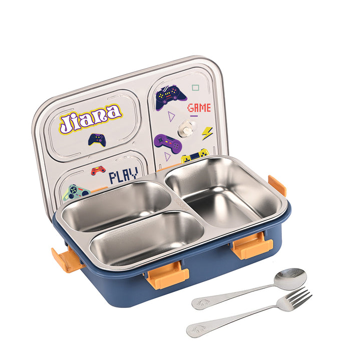 Meet our vibrant Personalized Kids' Steel Lunch Box! Crafted from durable stainless steel, it features three roomy compartments and a spill-proof lock, plus kid-friendly cutlery for easy, on-the-go meals. Perfect for school, picnics, or family outings—just pack, lock, and enjoy!