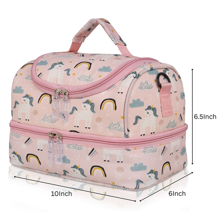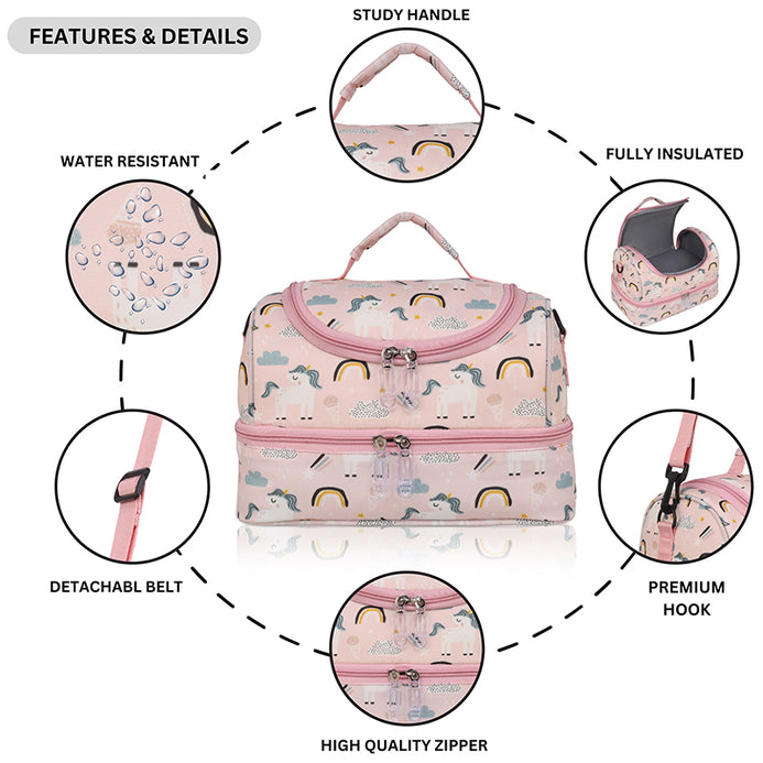 It keeps the food warm or cool,due to its INSULATED INTERIOR. It has a detachable belt that can be adjusted as per the kids height and a Convenient Handle too.