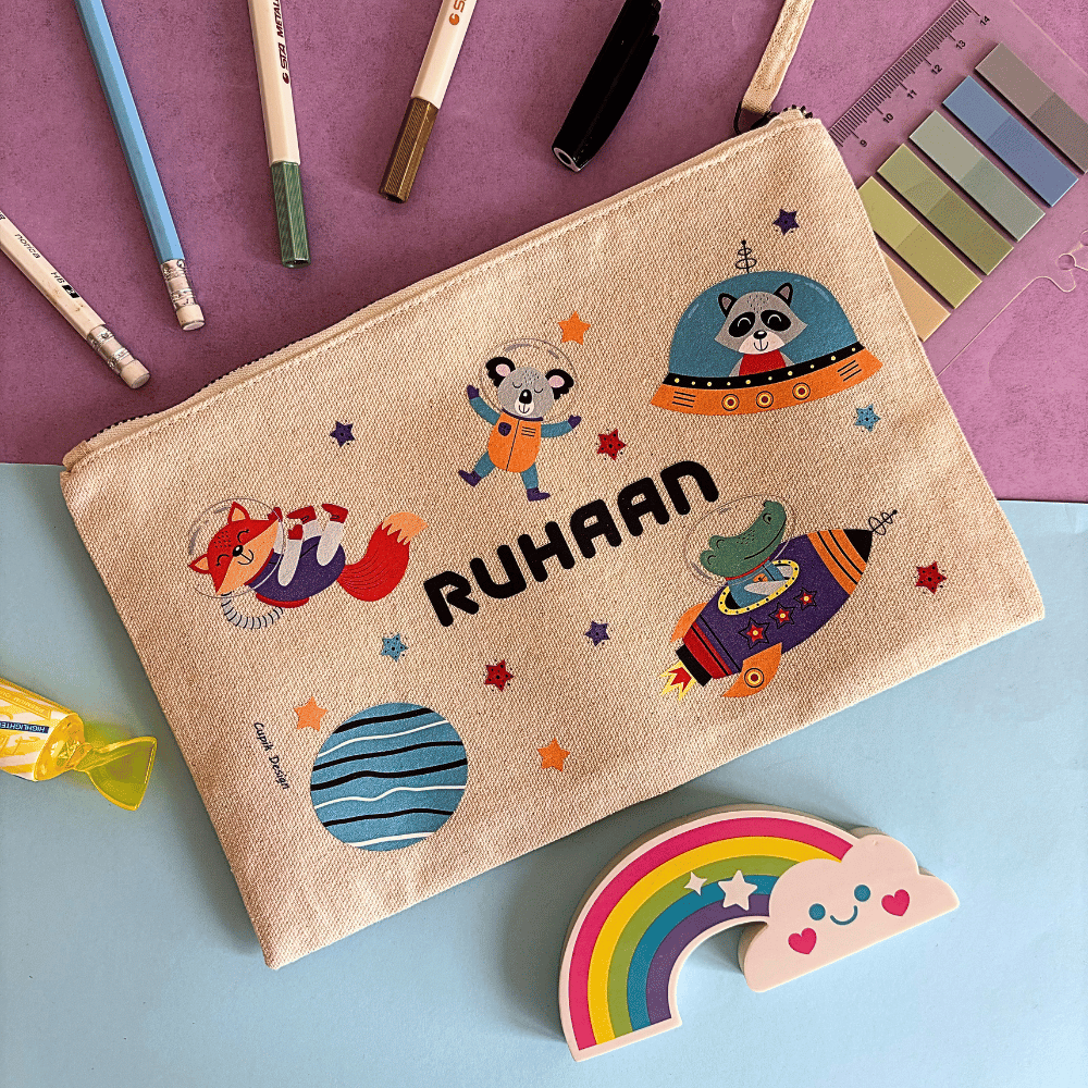 Discover the perfect school accessory for your kid – a personalized pouch that's as adorable as it is eco-friendly! Crafted from sustainable materials, it boasts charming designs and a travel-friendly size ideal for little ones. Customizable themes ensure it perfectly matches your child's style, while its soft yet durable fabric keeps school essentials safe. Sized just right to slip into their bags, this pouch is a must-have for every young scholar, adding a touch of fun and functionality to their daily routine.