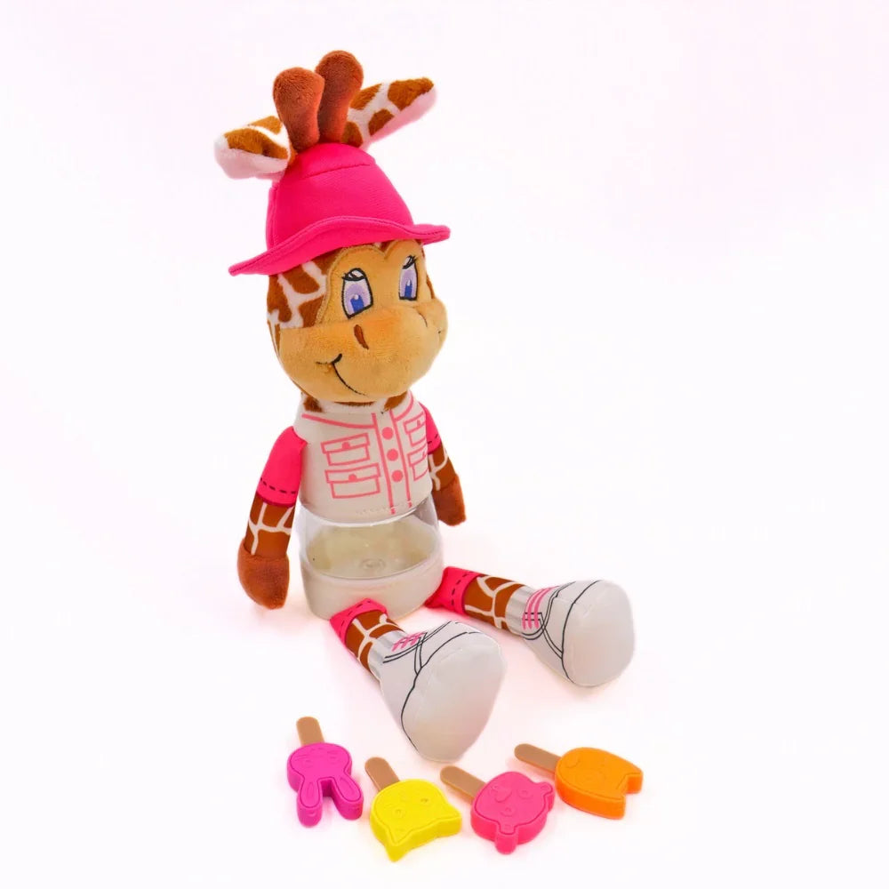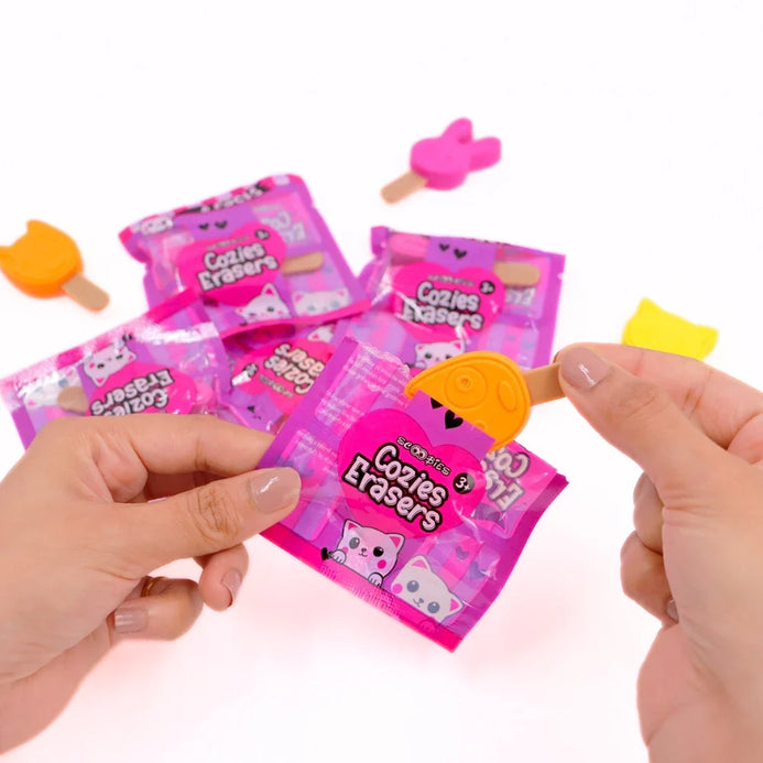 Pack Includes: Giraffe Cozy filled with a set of 4 erasers. Erasers come in 4 different colors (orange, yellow, pink, and purple) and in 4 animal-themed ice cream shapes (dog, cat, bear, and rabbit)