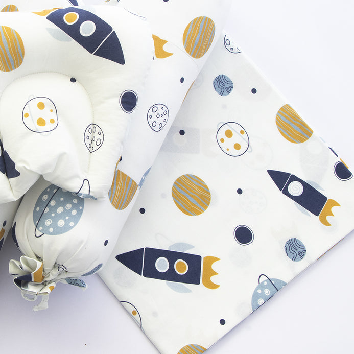 Soft, breathable & natural, Yellow Doodle Organic Cotton Bedsheet Set will encourage sweet zzZs for your little munchkin. This cot bed gift hamper includes a sheet, pillow and a pair of bolsters which are made from the finest certified organic cotton & is more durable and gentler on your baby’s tender skin. This bedding set is made from 100% GOTS certified premium organic cotton to create a smooth and soft finish and is also carefully crafted without harmful chemicals. Sized to fit standard crib and toddler mattresses, your baby will enjoy the softness of 100% premium organic cotton, so you both rest easy!