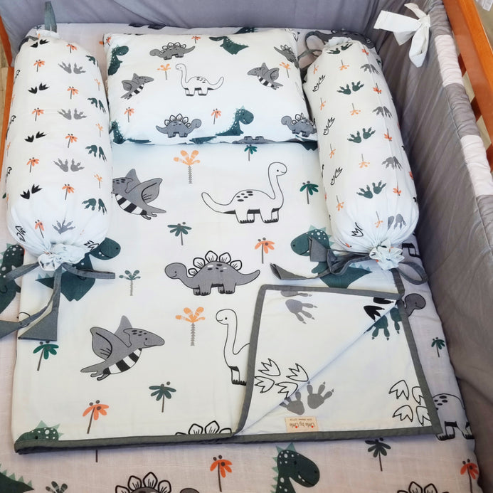 Dino Cot Bedding Set with Organic Baby Dohar Blanket, White