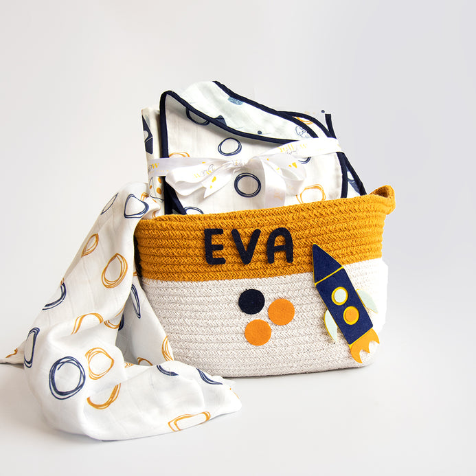 The Yellow Doodle must- have baby essentials gift basket features an array of iconic prints in our classic muslin- the softest & purest fabric for a newborn. This six piece gift hamper includes everything you'll need to coordinate an adorable, cheerful look that your little one will love! This luxury welcome baby gift basket includes- Adorable cotton storage basket- 1, Oh-So-Soft Muslin Blanket- 1, Organic Luxury Swaddle- 1, Doodle Baby Bib- 1, Doodle Burpy Cloth- 1, Organic Muslin Wipe- 1.