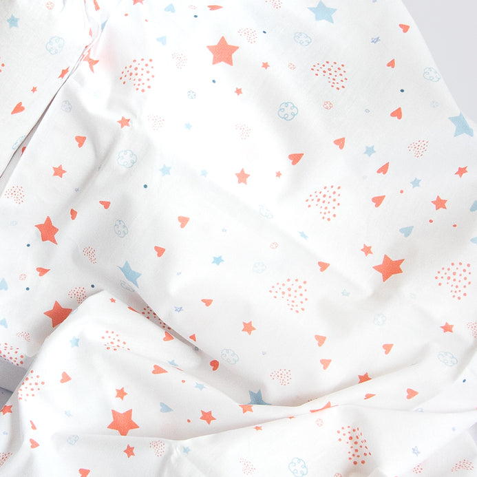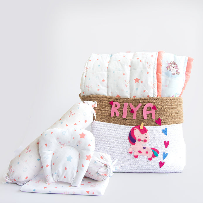 • SIZE & MAKE- 100% GOTS Certified Organic Cotton, generously sized with elegant designs- 1 Quilt- Reversible with a print at back, 110 x 90 cm, 1 Cot Bedsheet- 140 x 105 cm, 1 Pillow- 20 cm long x 23 cm wide, 2 Bolsters - 45 cm long x 32 cm wide each,1 Large Cotton Rope Basket - 40 x 30 x 30 cm. Hypoallergenic, environment- friendly AZO free dyes.