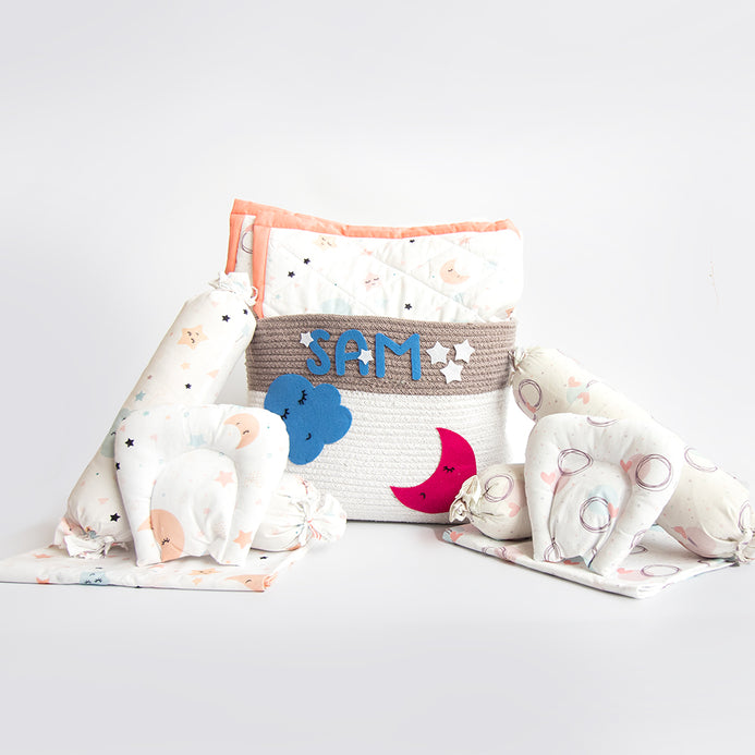 This luxury organic cotton bedding gift basket includes- Adorable cotton storage basket- 1, Oh-So-Cozy Comfort Quilt- 1, Cot Bedsheets- 2, Pillows- 2, Bolsters- 4.