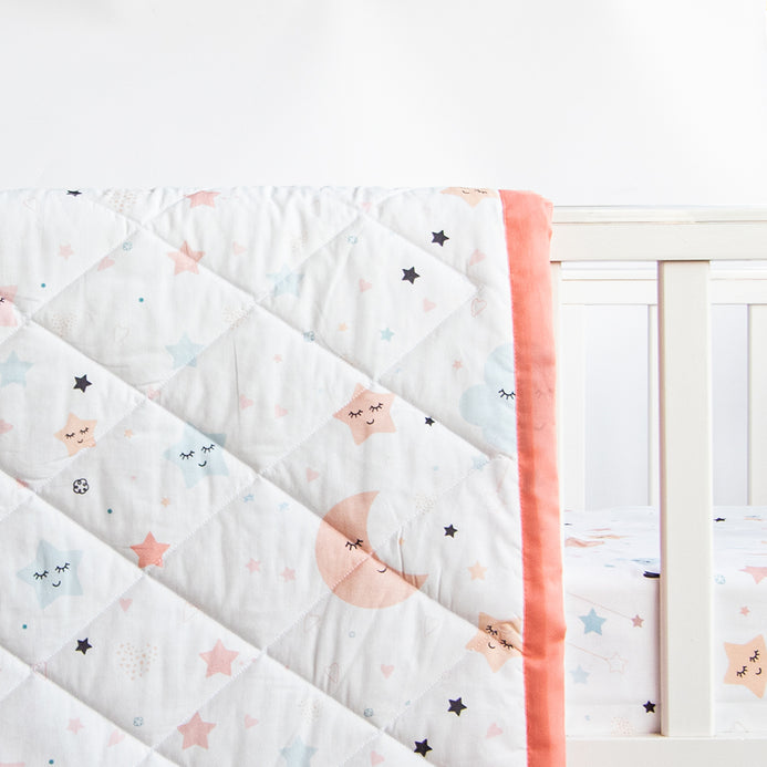 • SIZE & MAKE-100% GOTS Certified Organic Cotton, generously sized with elegant designs- Quilt- Reversible with a print at back, 110 x 90 cm, Cot Bedsheet- 140 x 105 cm, Pillow- 20 cm long x 23 cm wide, Bolster - 45 cm long x 32 cm wide, Large Cotton Rope Basket - 40 x 30 x 30 cm.Hypoallergenic, environment- friendly AZO free dyes. Handmade with care in India.