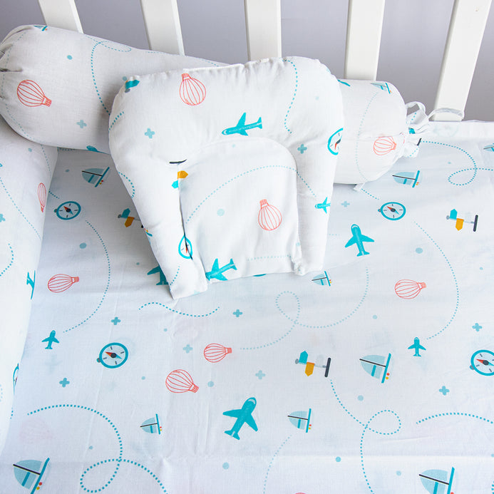 This luxury organic cotton bedding gift basket includes- Adorable cotton storage basket- 1, Oh-So-Cozy Comfort Quilt- 1, Cot Bedsheets- 2, Pillows- 2, Bolsters- 4.