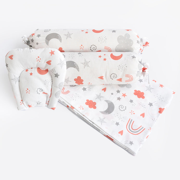 Soft, breathable & natural, Yellow Doodle Organic Cotton Bedsheet Set will encourage sweet zzZs for your little munchkin. This cot bed gift hamper includes a sheet, pillow and a pair of bolsters which are made from the finest certified organic cotton & is more durable and gentler on your baby’s tender skin. This bedding set is made from 100% GOTS certified premium organic cotton to create a smooth and soft finish and is also carefully crafted without harmful chemicals. Sized to fit standard crib and toddler mattresses, your baby will enjoy the softness of 100% premium organic cotton, so you both rest easy!