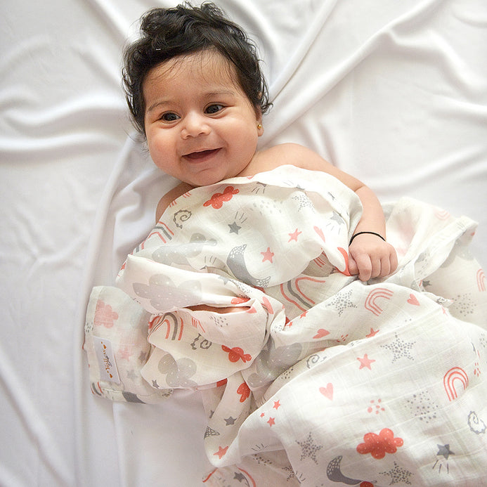 A true assortment of premium cotton-rich and baby muslin must-haves, our selection of beautifully curated baskets make the perfect gifts. This collective welcome baby gift basket includes- Adorable cotton storage basket- 1, Oh-So-Soft Muslin Blanket- 1, Organic Luxury Swaddle- 1, Doodle Baby Bib- 1, Doodle Burpy Cloth- 1, Organic Muslin Wipe- 1, Baby Milestones Collection- Set of 10 cards, Sensory soft toy -1