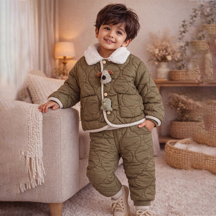 1. Design: This cozy winter 2-piece set features a brown quilted jacket with a soft white faux-fur collar, paired with matching quilted pants with cute plush soft accents on the jacket add a playful touch, making it perfect for winter outings.
