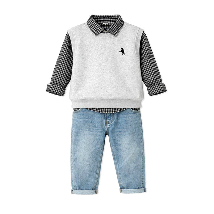 1.Smart & Stylish Design: This stylish set features a grey full-sleeve checkered shirt layered with a classic grey sleeveless sweater vest, paired with light-wash denim pants, creating a timeless and effortlessly stylish look perfect for casual and semi-formal occasions.