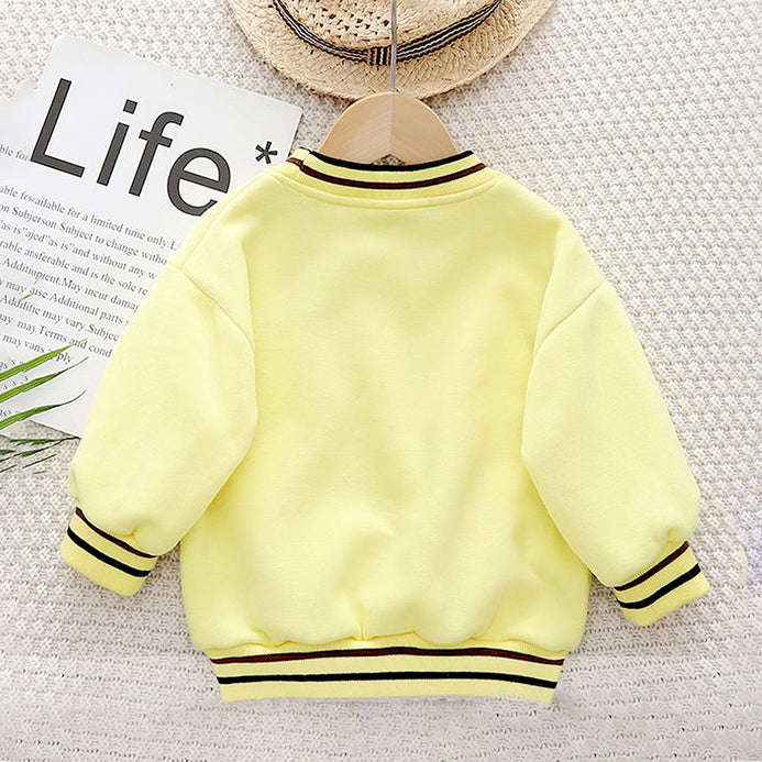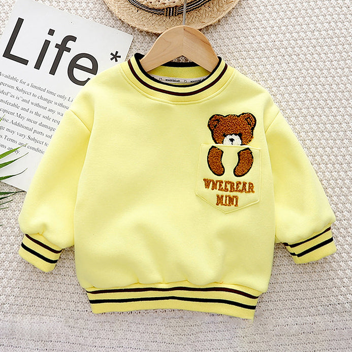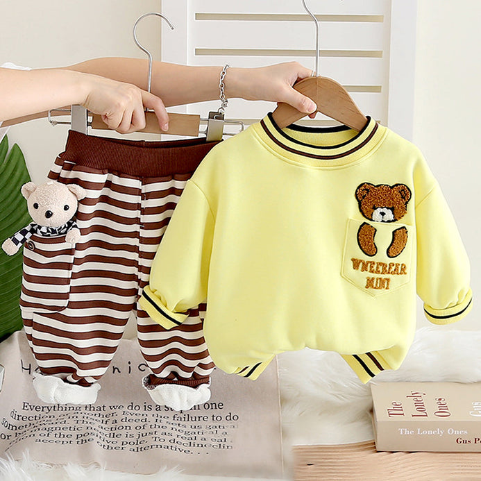 1. 3D Teddy Design: This adorable kids tracksuit set features a yellow sweatshirt with a cute teddy bear pocket design and contrast brown detailing on the neckline, cuffs, and hem. It is paired with matching brown and white striped pants, with teddy bear soft toy adding a fun and interactive element that your kids will love.