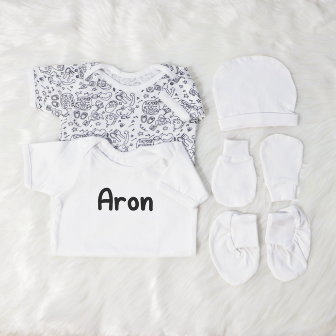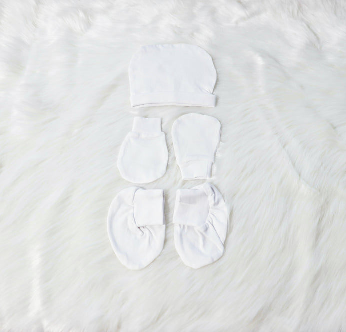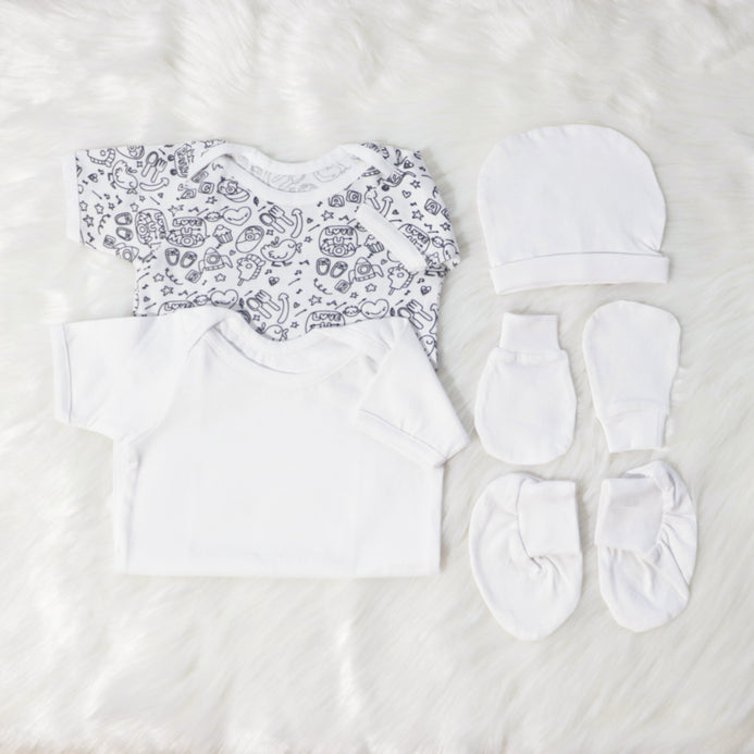 • Set of 7 - 1 cotton cap, 1 pair of mittens, 1 pair of booties, 2 bodysuits.