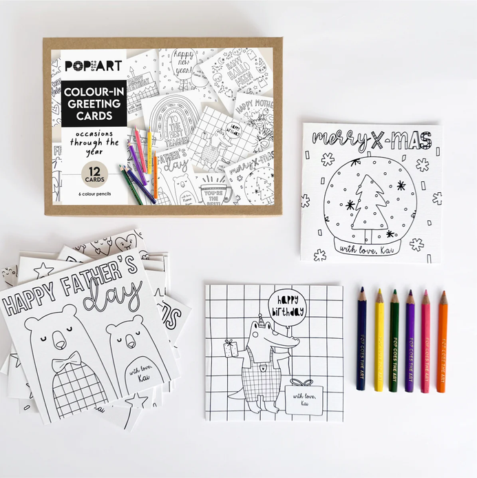 These Colour-In Greeting cards are perfect for any child to add that special touch while wishing loved ones. The 12 personalised cards cover all important occasions throughout the year, such as Father’s Day, Mother’s Day, Diwali, Teacher’s Day, birthdays etc. Watercolour pencils, complete the set, making it a great gift to give too!