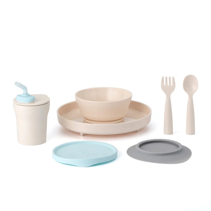 - Miniware Little Foodie All-in-one Feeding Set Plan includes 1 Cassava PLA Cereal Bowl with 1 Silicone Lid, 1 PLA Sandwich Plate, 1 My First Cutlery Spoon & Fork Set, 1-2-3 Sip Cup in PLA with straw, and 1 detachable suction foot.