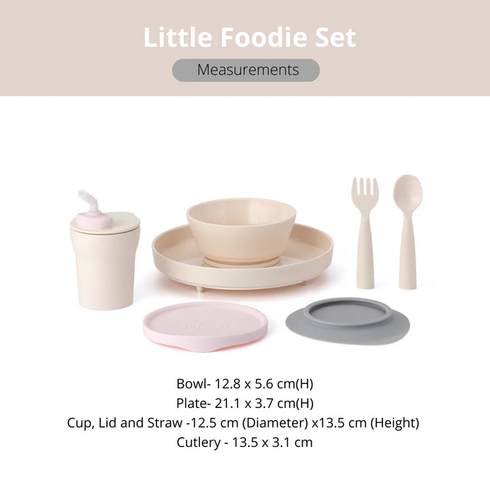 - Miniware Little Foodie All-in-one Feeding Set Plan includes 1 Cassava PLA Cereal Bowl with 1 Silicone Lid, 1 PLA Sandwich Plate, 1 My First Cutlery Spoon & Fork Set, 1-2-3 Sip Cup in PLA with straw, and 1 detachable suction foot.
