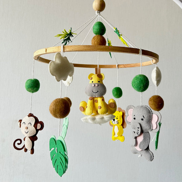 This mobile features the Monkey, Lion, Giraffe, and a Elephant. Each of the elements are attached to the wooden ring using a cotton thread.