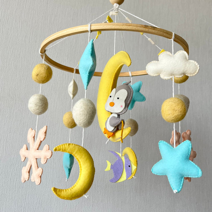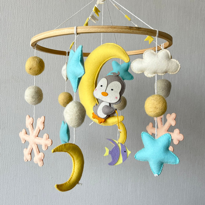 This mobile features the Stars, Moons, Clouds, Snow-Flake and a Penguin on a Moon. Each of the elements are attached to the wooden ring using a cotton thread.