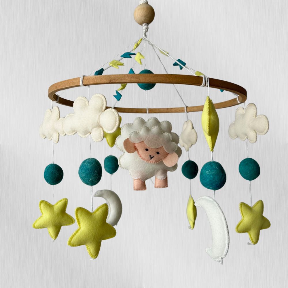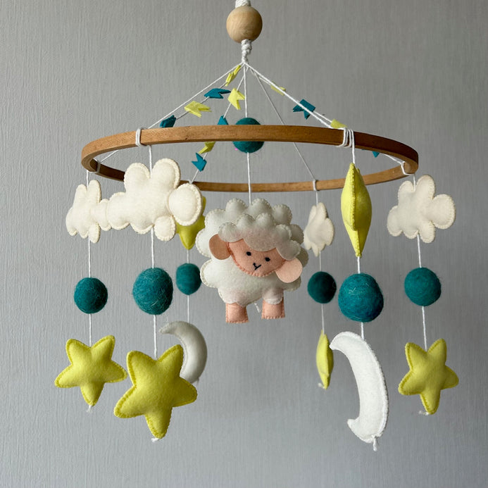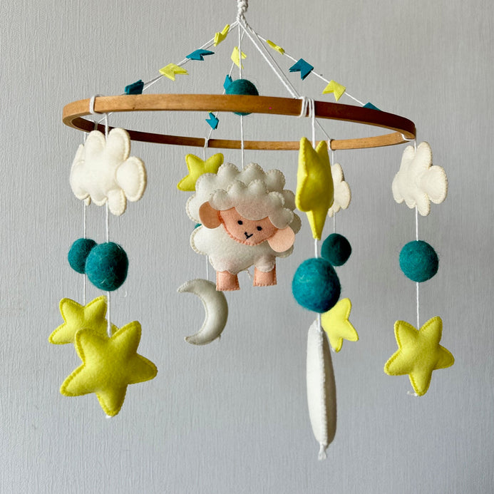 This mobile features the Stars, Moons, Clouds, and a Sheep. Each of the elements are attached to the wooden ring using cotton thread.