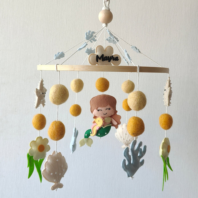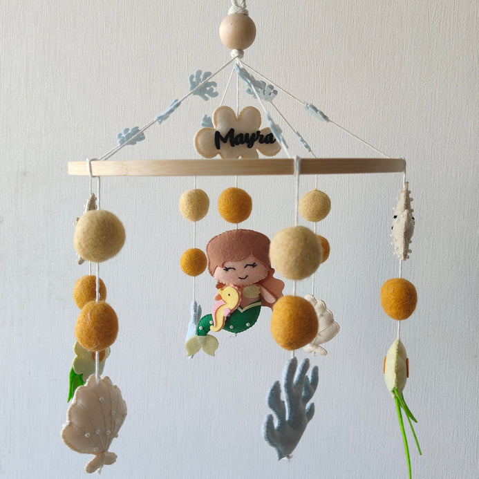 This mobile features the Shell, Flowers, Starfish, and a Mermaid. Each of the elements are attached to the wooden ring using cotton thread.