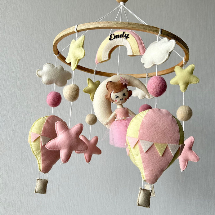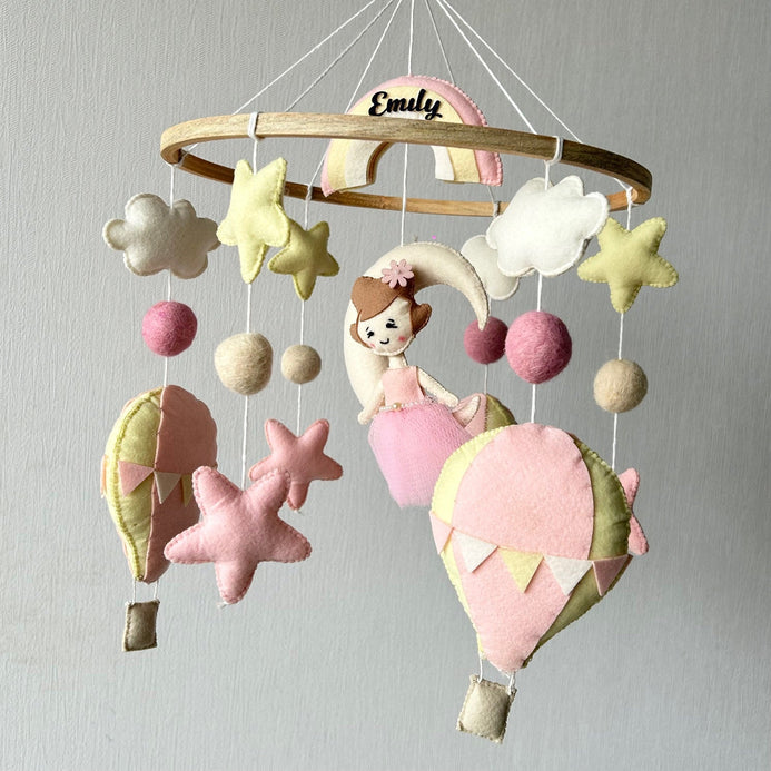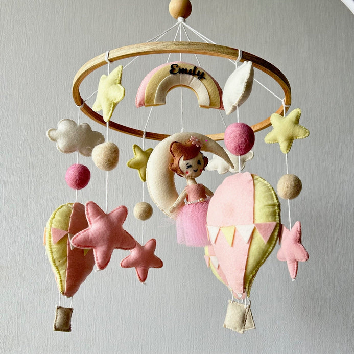 This mobile features the Stars, Clouds, Hot Air Balloons, Moon, Rainbow, and a Fairy. Each of the elements are attached to the wooden ring using cotton thread.
