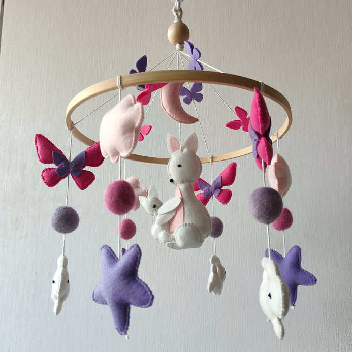 This mobile features the Clouds, Butterflies, Rabbits, Moon and a Bunny Family. Each of the elements are attached to the wooden ring using cotton thread.