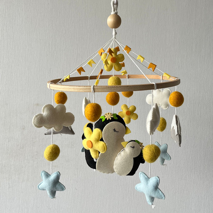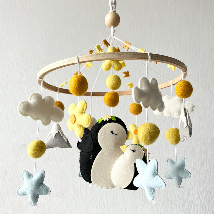 This mobile features the Star, Clouds, Flower, and a Penguin Family. Each of the elements are attached to the wooden ring using cotton thread.