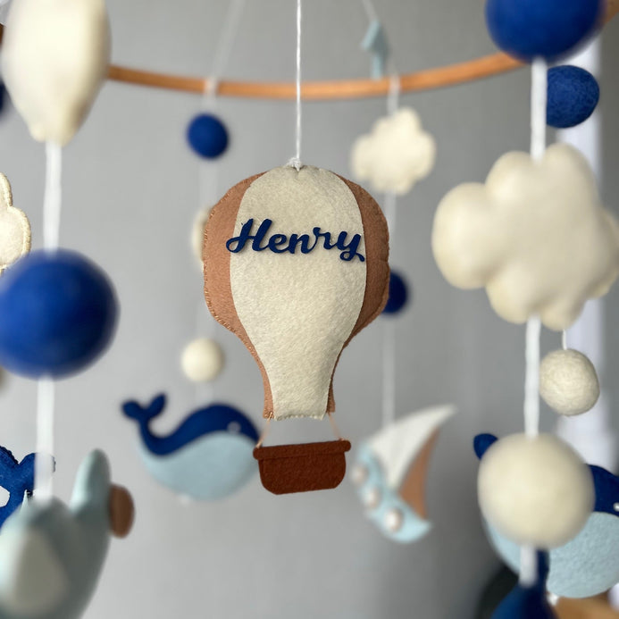 This mobile features the Aeroplane, Yatch, Whales, Clouds, and a Hot Air Balloon. Each of the elements are attached to the wooden ring using cotton thread.