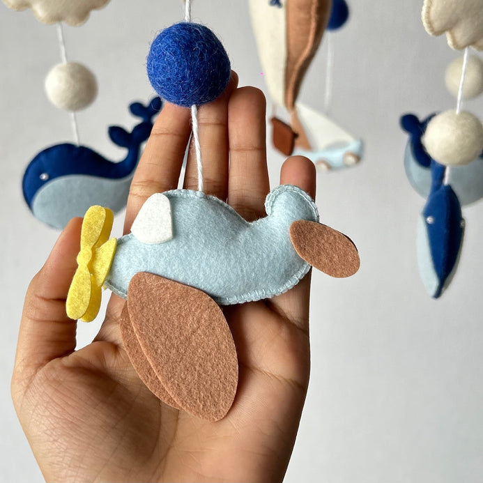 This mobile features the Aeroplane, Yatch, Whales, Clouds, and a Hot Air Balloon. Each of the elements are attached to the wooden ring using cotton thread.