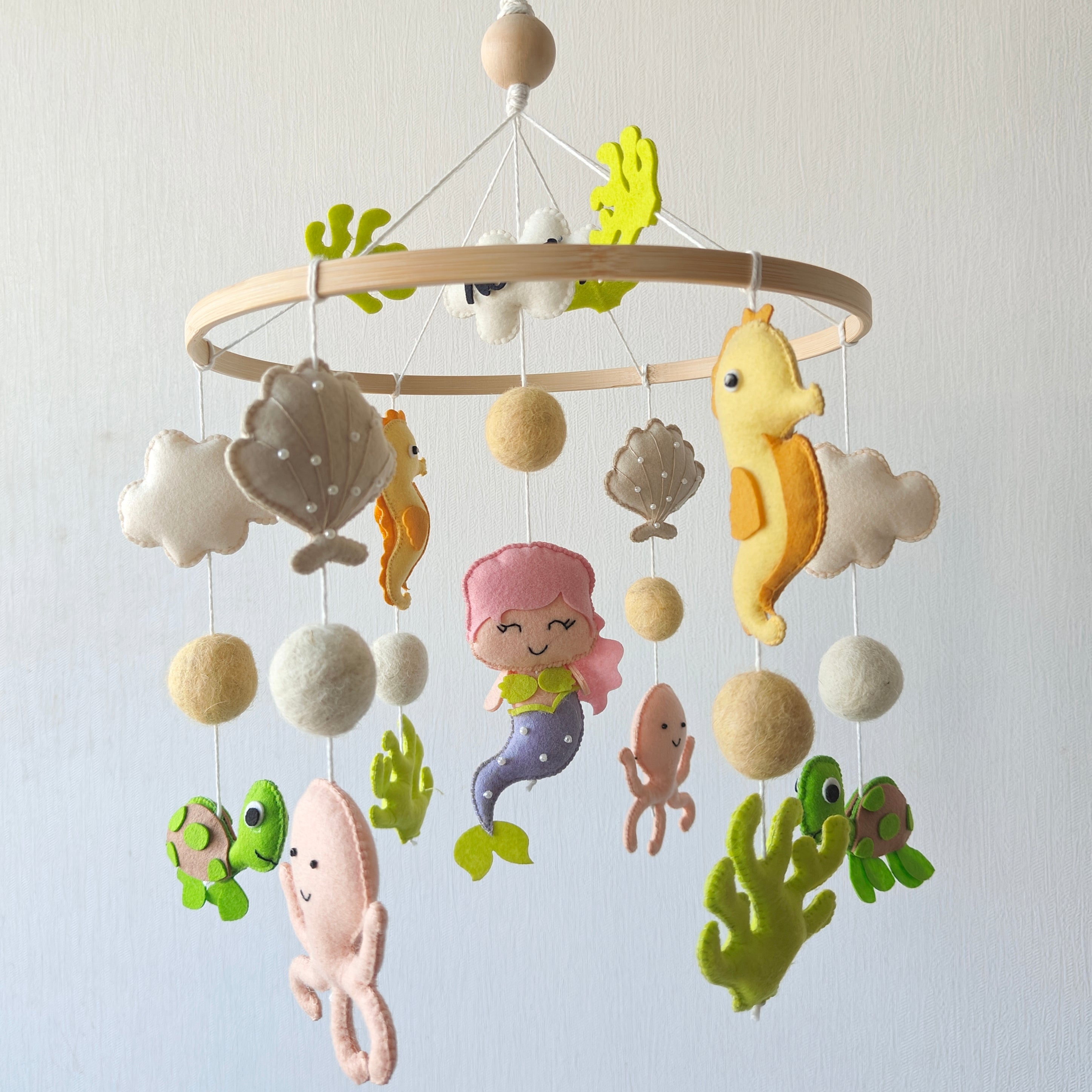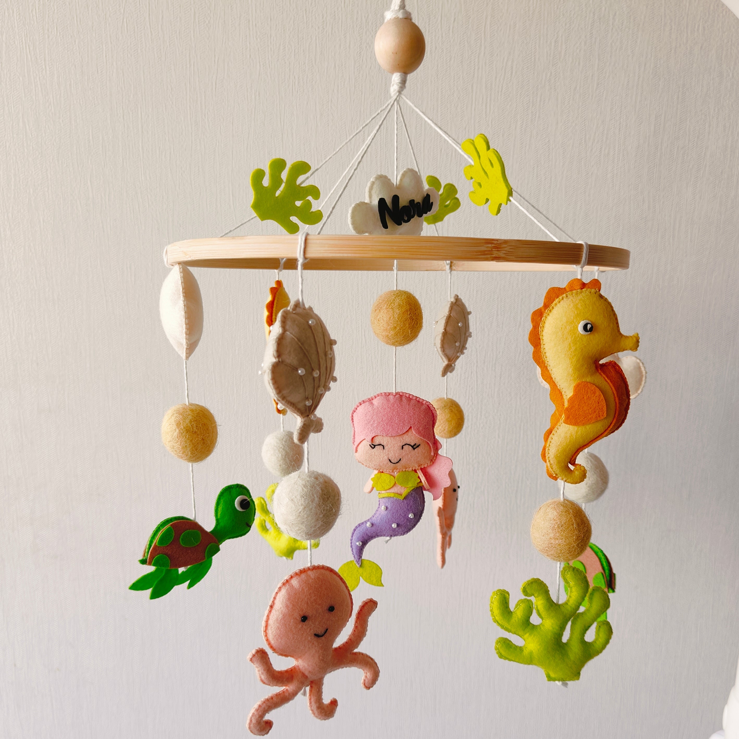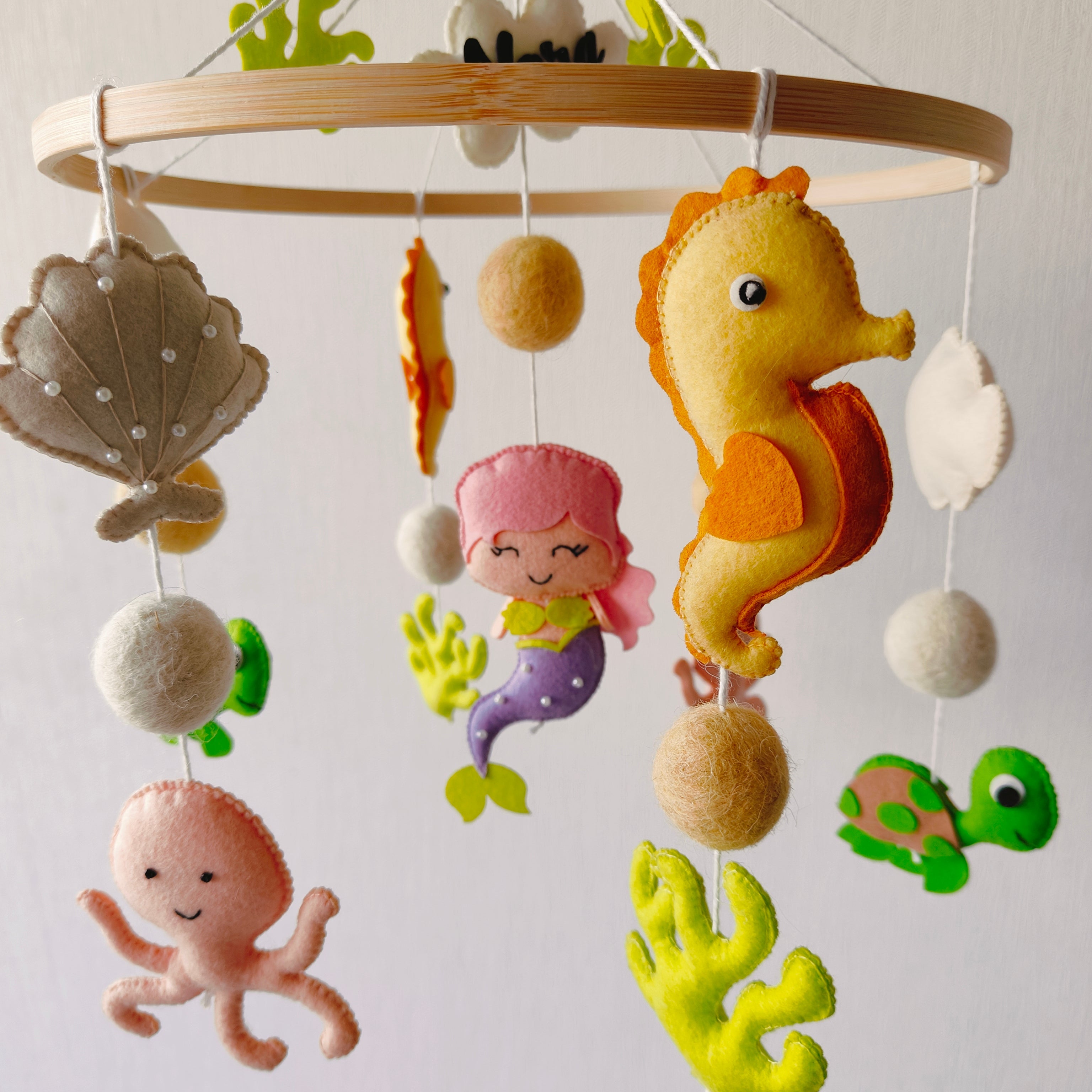 This mobile features the Tortoies, Shells, Starfish, Octopus, Sea weed, Seahorse and a Mermaid. Each of the elements are attached to the wooden ring using cotton thread.