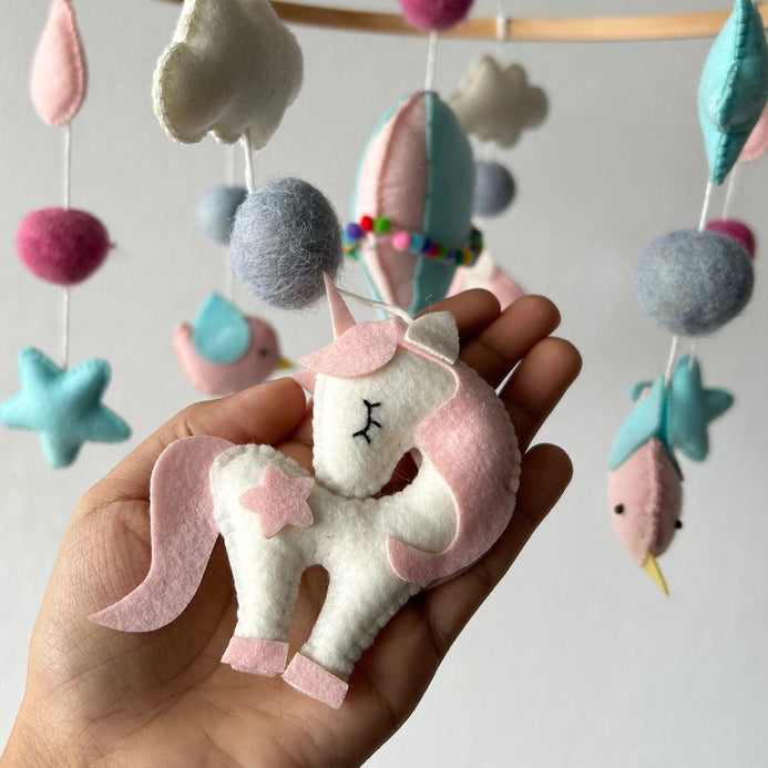 This mobile features the Stars, Unicorns , Rainbow, Birds , Droplets and a Hot Air Balloon. Each of the elements are attached to the wooden ring using cotton thread.