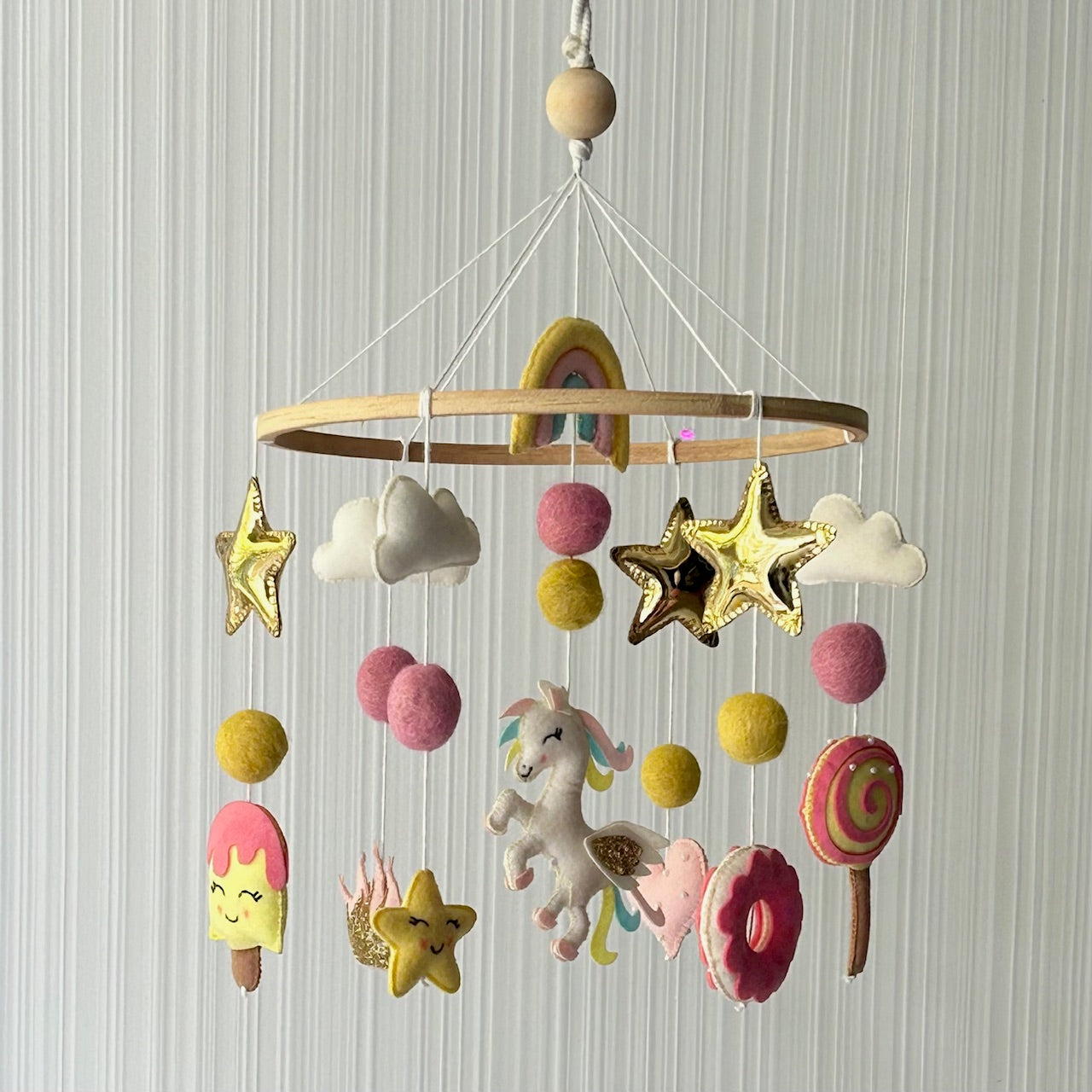 This mobile features the Star, Hearts, Cloud, Crown, Donut, Ice-Cream, Rainbow, and a Unicorn. Each of the elements are attached to the wooden ring using cotton thread.