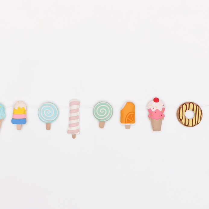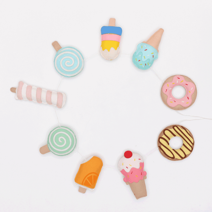 Our cute felt ice cream themed garland immediately sets the tone to your kidàroom dïr. These can be hung across walls or on cribs or the kids shelf or kids room door. Decorated with different colourful popsicles & donuts, this bunting can make perfect addition to the kidàroom theme.
