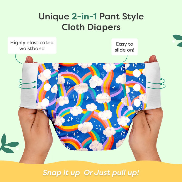 Putting them on is as easy as slipping into underwear. With these 2-in-1 pant style cotton diaper pants, you can choose between using the snap enclosures or a quick pull-up for when your baby is in the mood for running around. Let a diaper change not stop their fun and games.