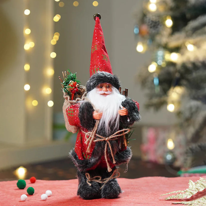 2. Detailing: Designed with faux fur fabric, rich red accents, and rope embellishments, this Santa carries a burlap sack filled with pine branches and red berries in one hand, and wooden logs in the other. The contrast of dark fur and vibrant red details gives it a bold, festive, and sophisticated look that beautifully enhances any Christmas décor setting.