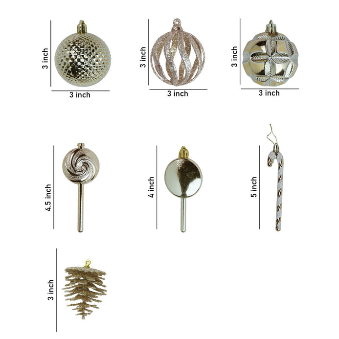 2. Champagne Gold & White Themed Xmas Balls: This set includes 14 beautifully crafted ornaments inspired by luxurious festive styling. The collection features a stunning blend of champagne gold textured balls, glossy baubles, glitter-coated pinecones, swirl lollipops, striped candy canes, and more. Each ornament showcases refined detailing and a soft golden shine, adding a classy and sophisticated charm to your Christmas tree.