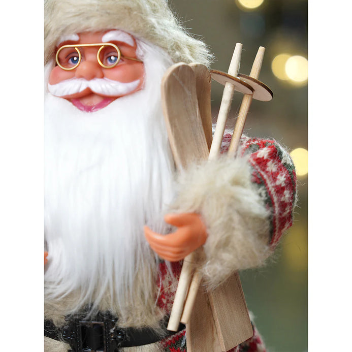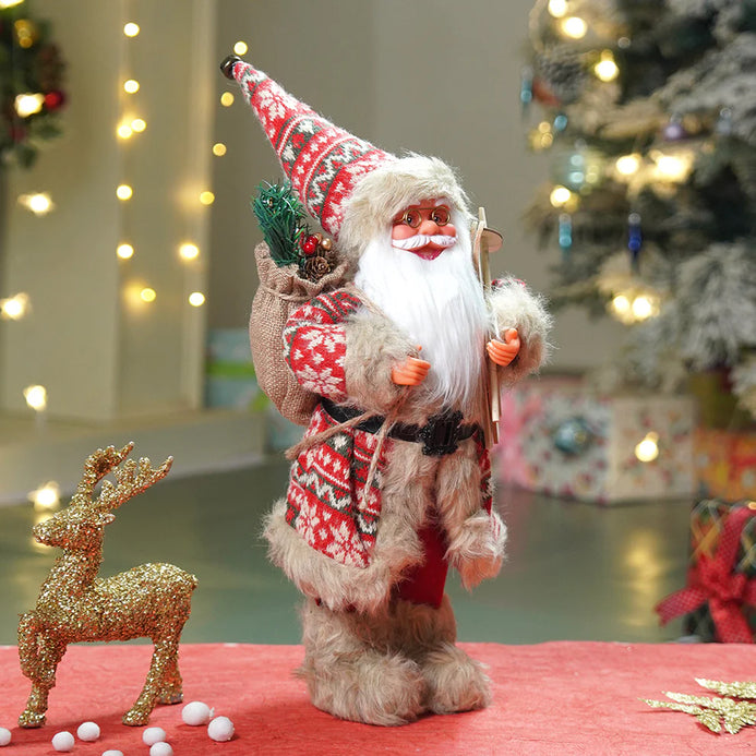 2. Detailing: Designed with soft faux fur, knit fabric, and wooden detailing, this Santa carries a burlap sack filled with pine branches and red berries on his shoulder while holding a pair of wooden skis, symbolizing the spirit of winter adventure and the joy of Christmas giving.
